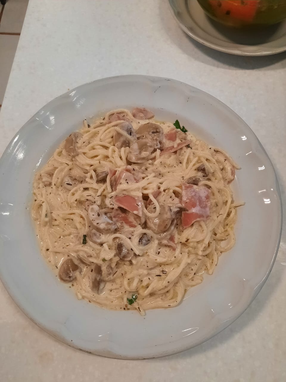 A la crema con jamón, champiñones y queso parmesano.