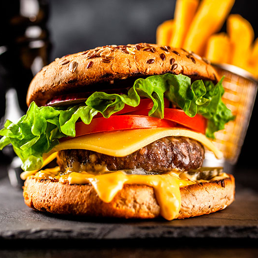 HAMBURGUESA SENCILLA ( CARNE DE RES VEGETALES QUESO AMARILLO Y QUESO OXAQUEÑO MAS CATSUP Y MOSTAZA)