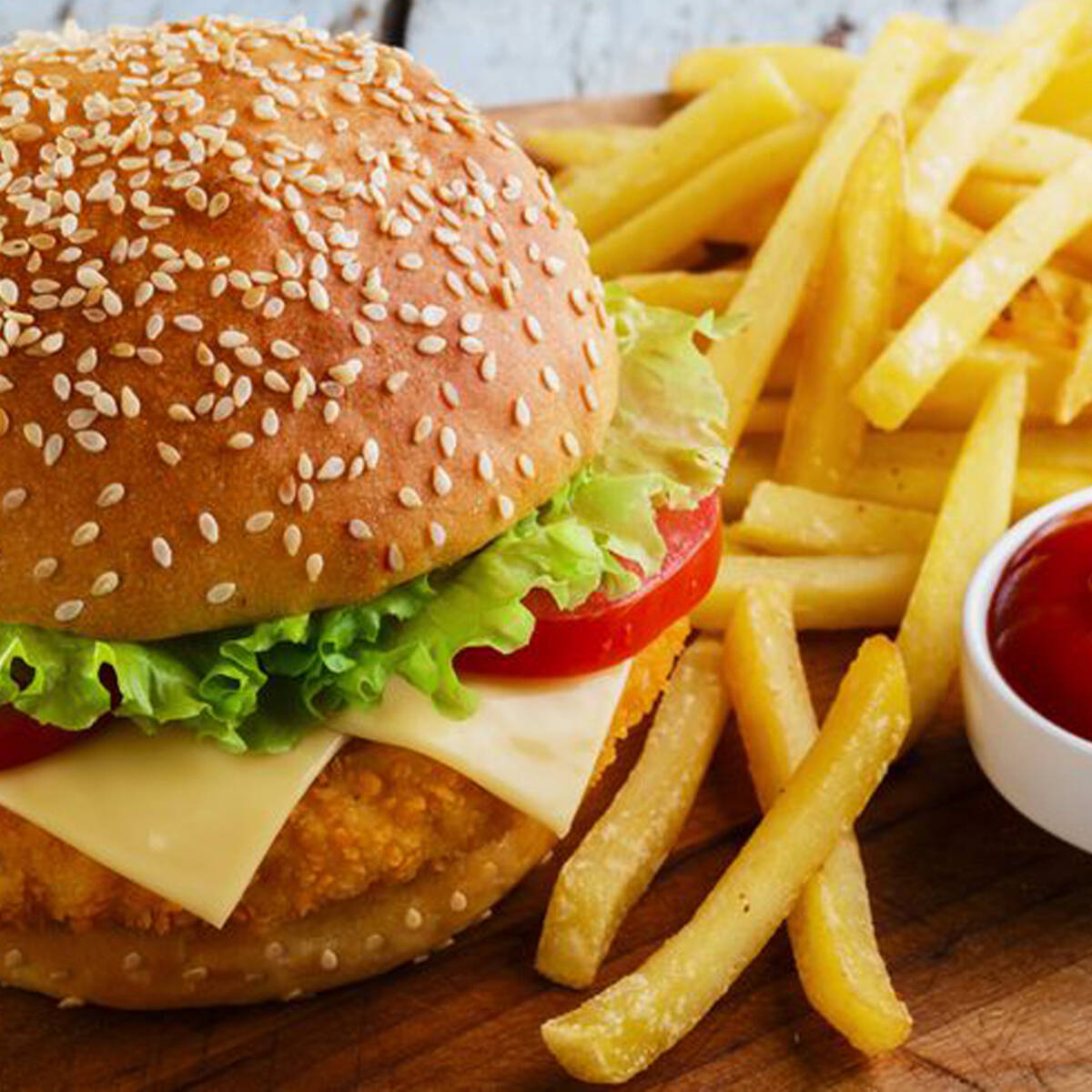 Hamburguesa grande sencilla, pan, mayonesa, carne marinada, jamón, queso amarillo,lechuga fresca, jitomate, cebolla, chile en vinagre, catsup, mostaza y una porción de papas a la francesa, limon y salsa valentina.