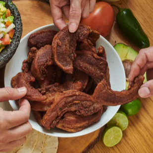 Chicharrón frito carnudo (250 g) acompañado con guacamole.