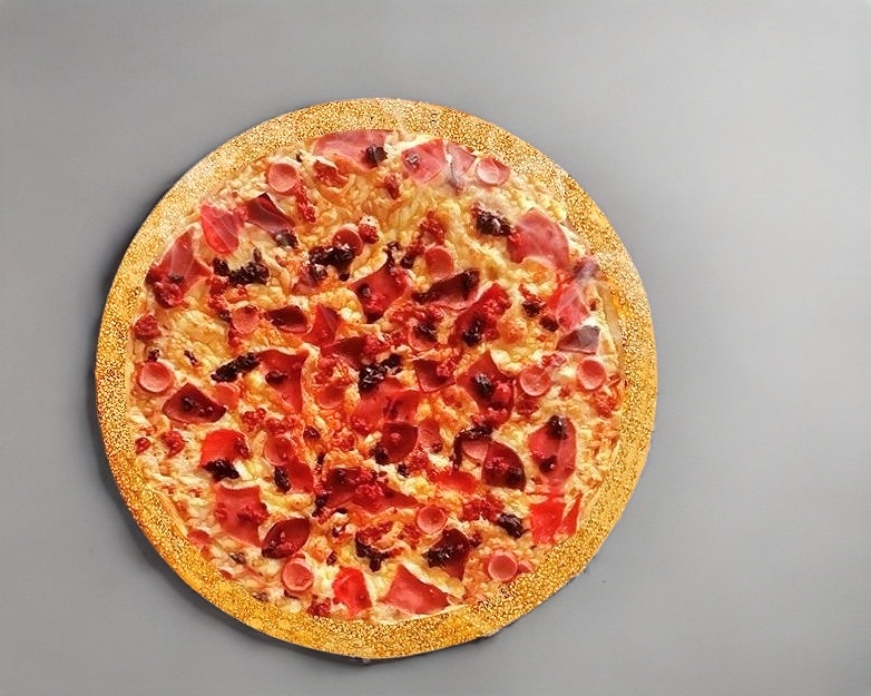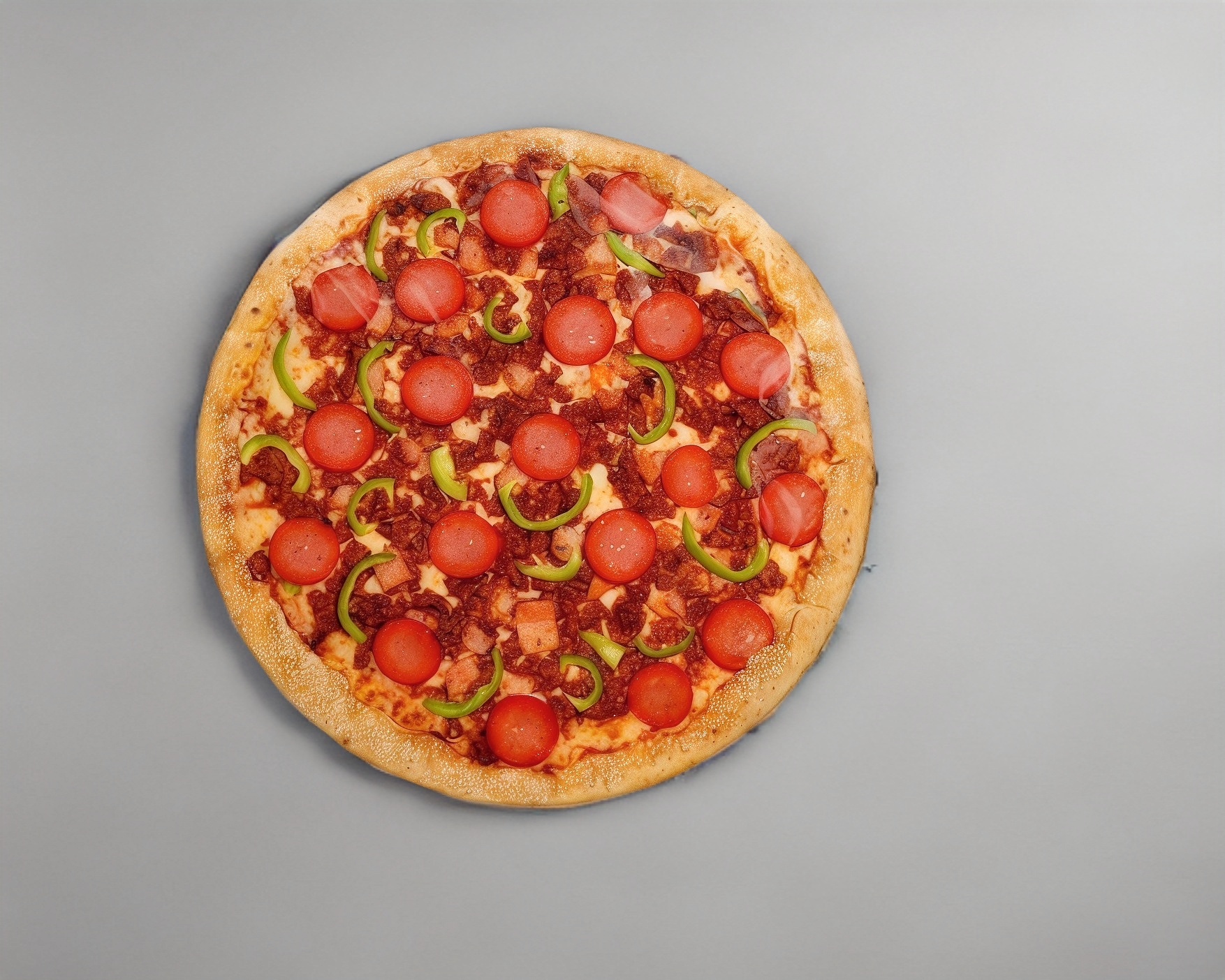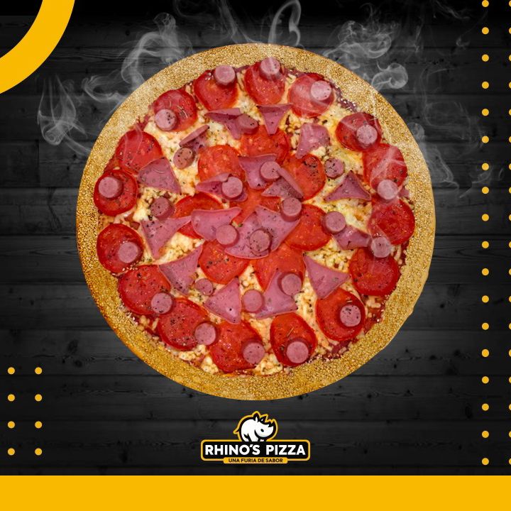 Deliciosa pizza con salsa italiana , queso mozzarella, pepperoni, jamón, salchicha y especias italianas.