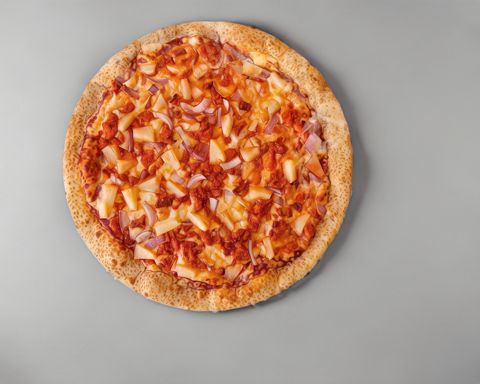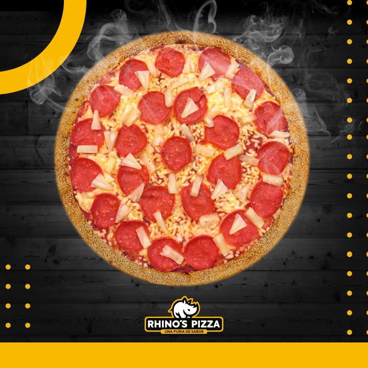 Deliciosa pizza con salsa italiana, queso mozzarella, pepperoni y piña.