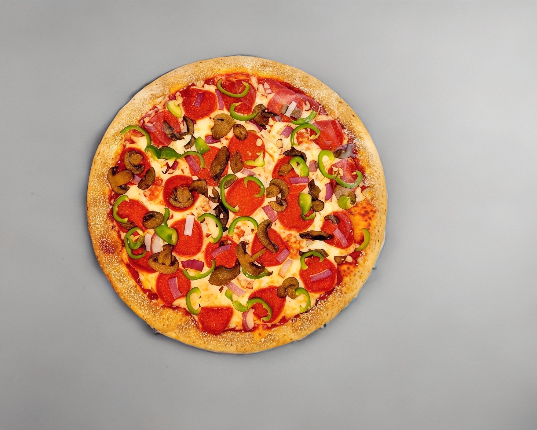 Deliciosa pizza con salsa italiana, queso mozzarella, pepperoni y champiñones.