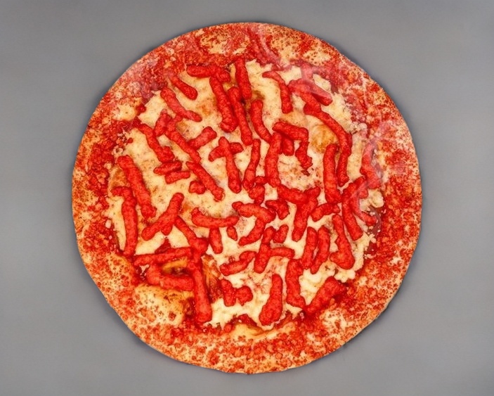 Deliciosa pizza con salsa italiana, queso mozzarella y Cheetos flamin hot.