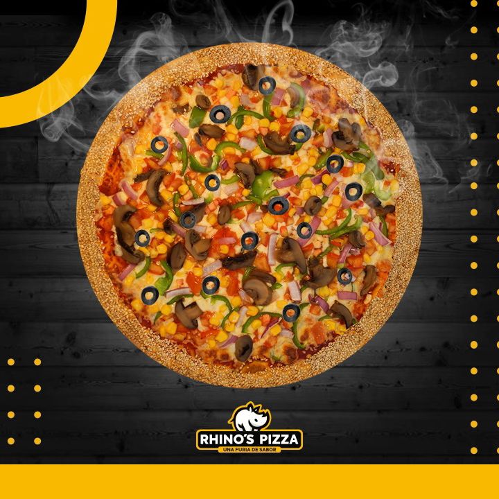 Champiñones, elote dorado, cebolla, jitomate, pimiento verde, aceitunas y extra queso.