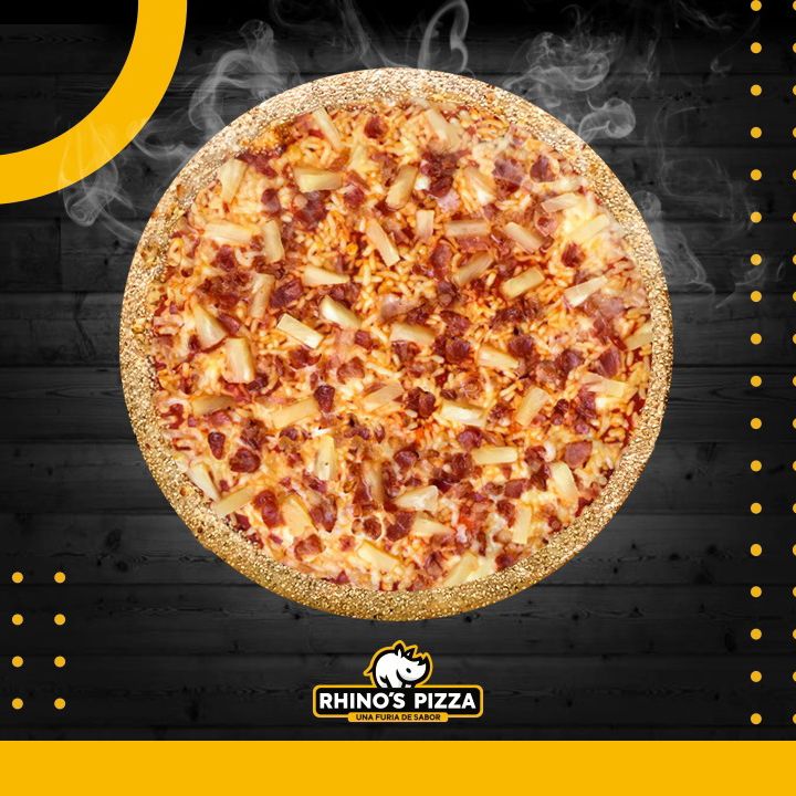 Deliciosa pizza con salsa italiana, queso mozzarella, jamón y piña.