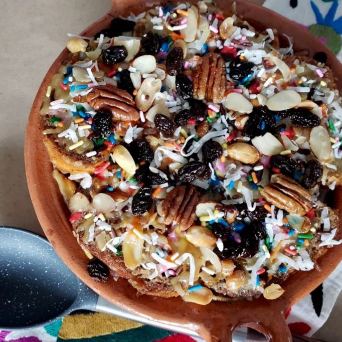Postre tradicional con bolillo, semillas, frutos secos, coco, grajea, canela y un preparado a base de piloncillo