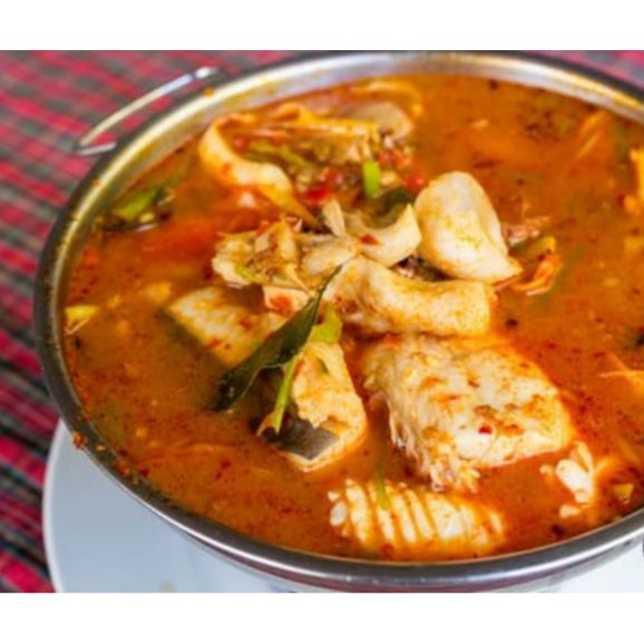 Delicioso caldo guisado con chile guajillo y especias acompañado de verdura, con carne de pescado sin espinas incluye 1 guarnición, salsa y tortillas