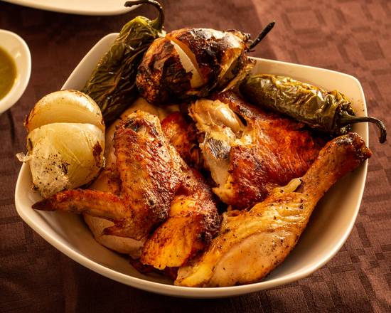 1 pollo, 2 complementos a elegir (papas, arroz, ensalada, tortillas o totopos) salsa.