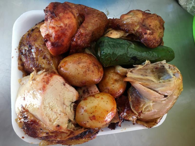 2 pollos, papas, arroz, ensalada y salsas.