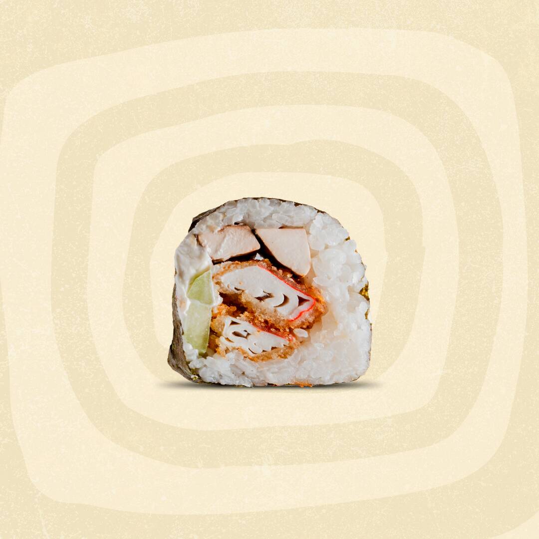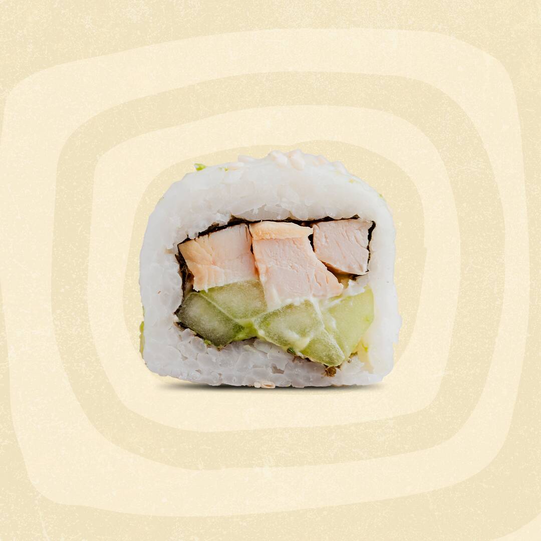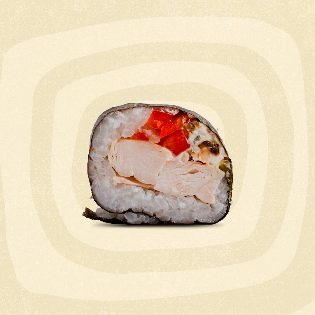 Cubierto de nori, con relleno de pechuga de pollo, cremoso de chile tatemado, morrón rojo y cebolla caramelizada.