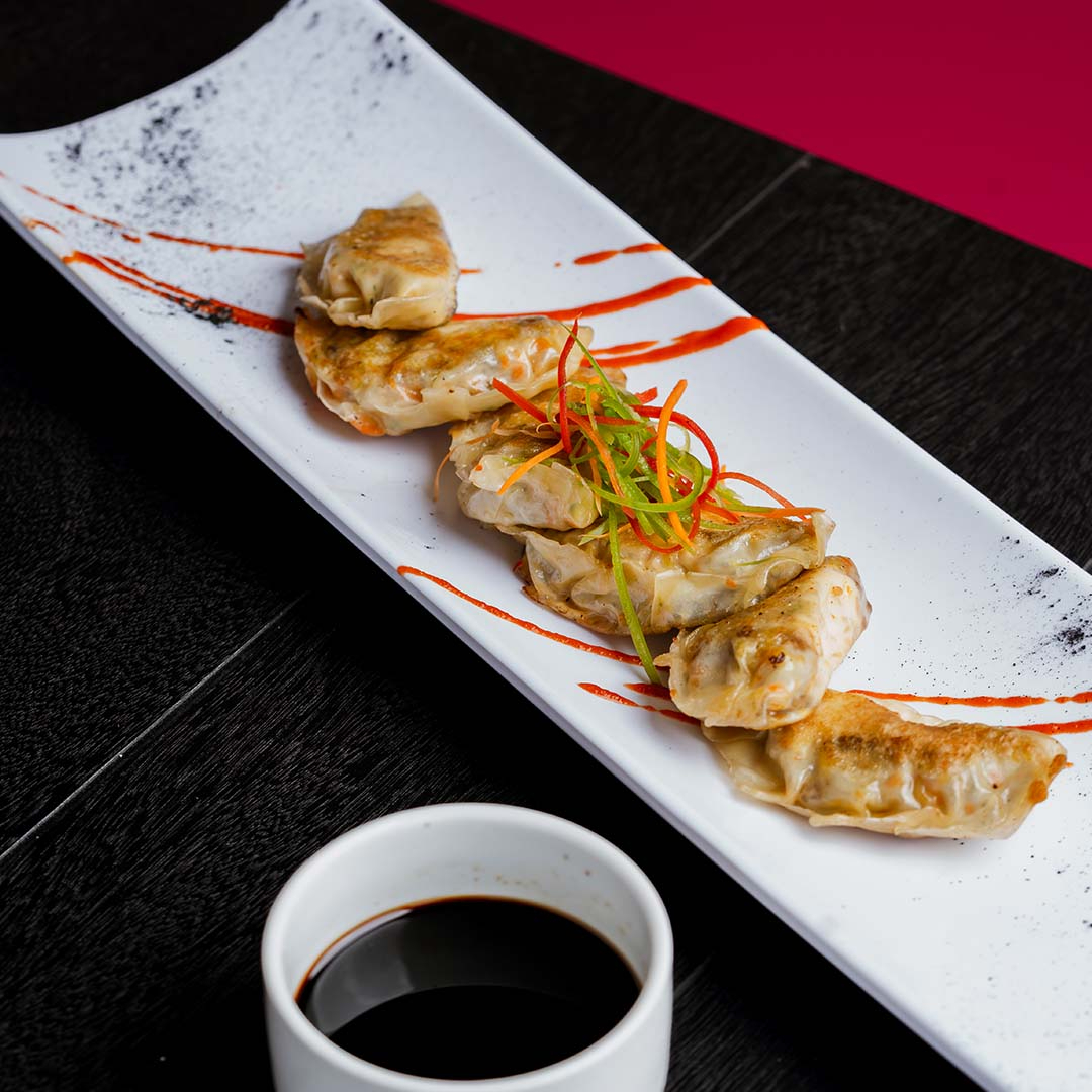 Gyosas planchadas rellenas de y verduras con cremoso de sésamo.