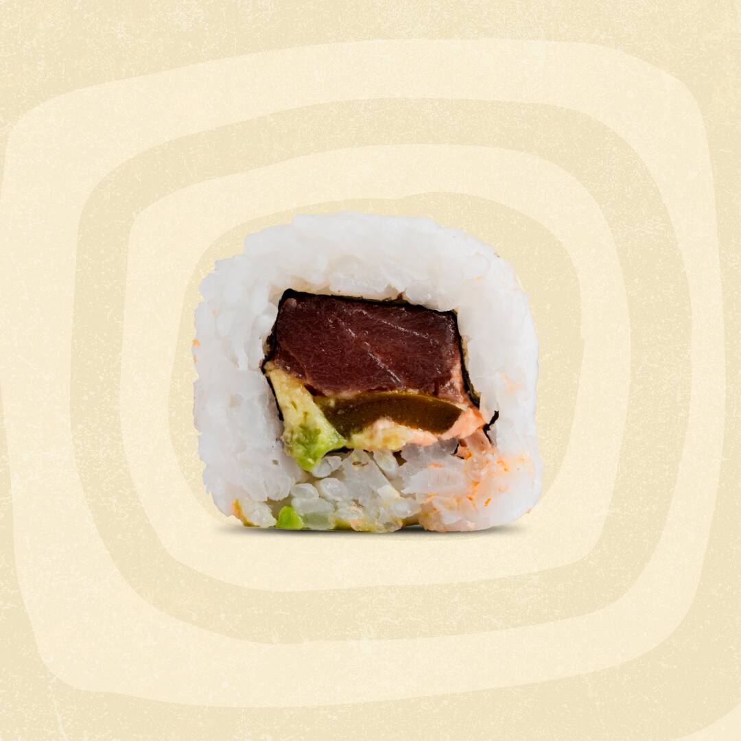 Cubierto de mix de sésamo, con relleno de nori, atún fresco, cremoso de sriracha, chile jalapeño y aguacate.