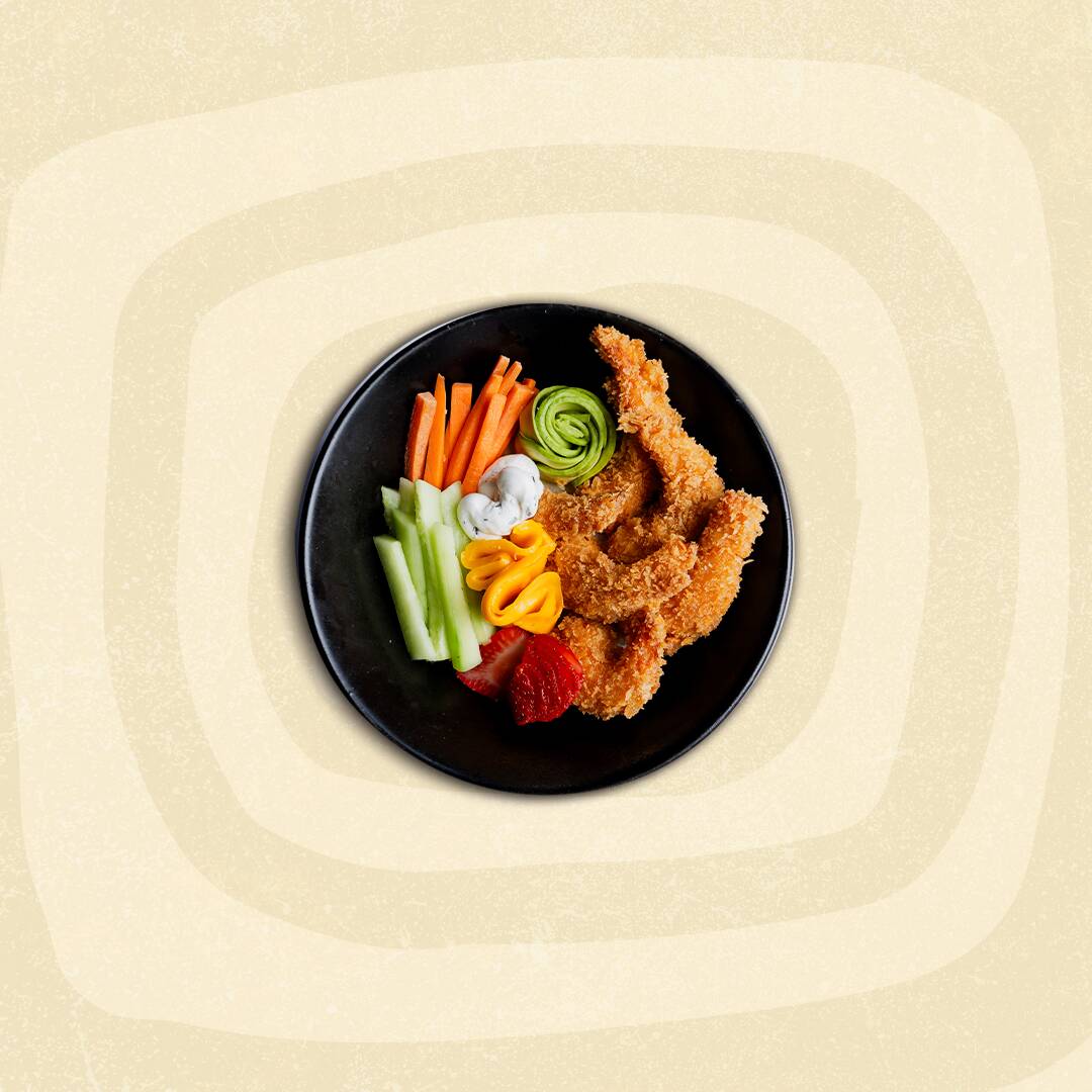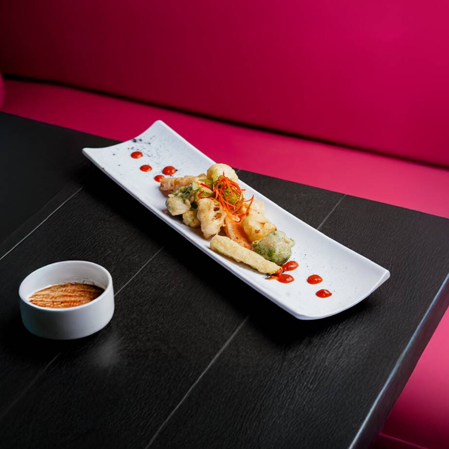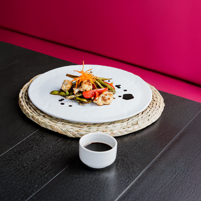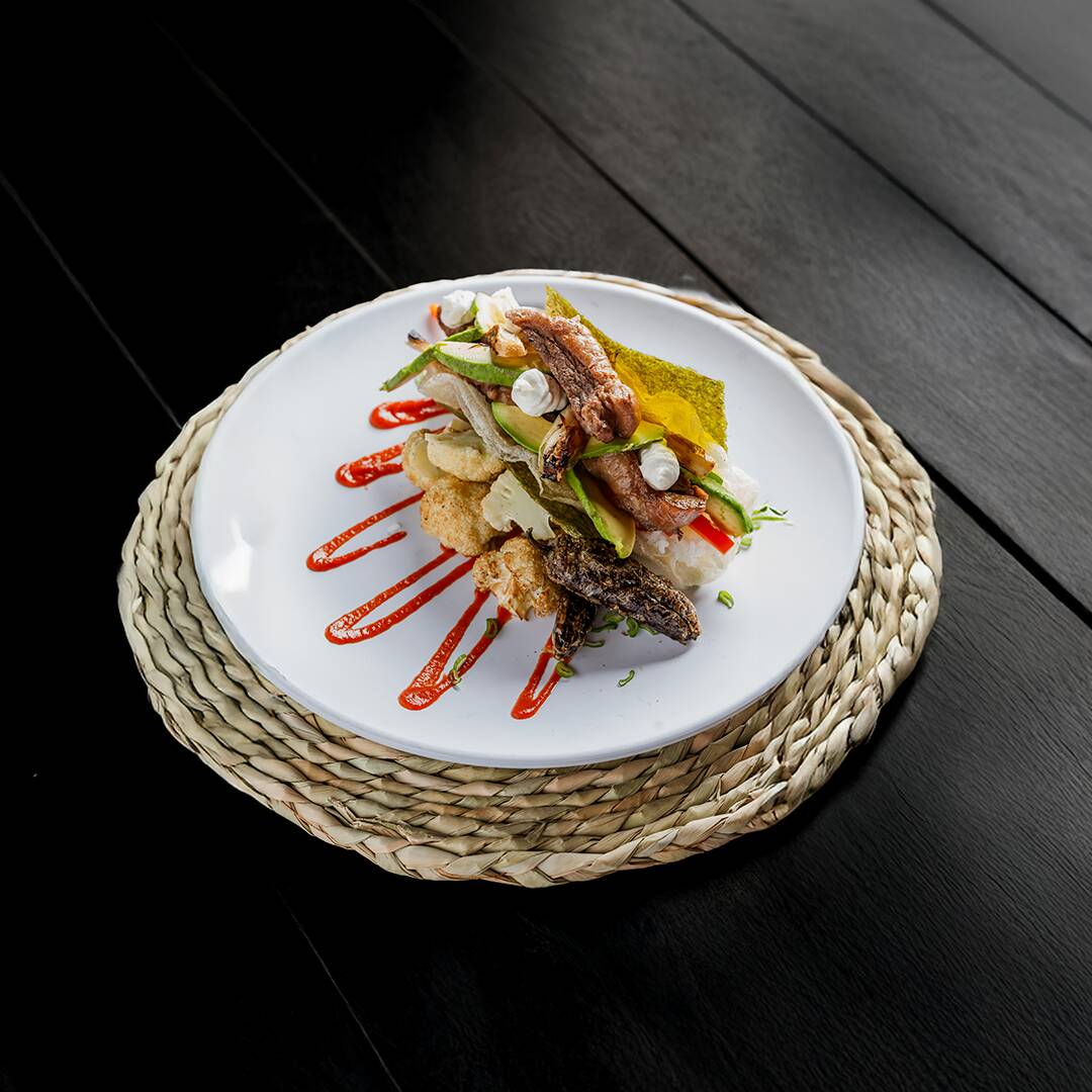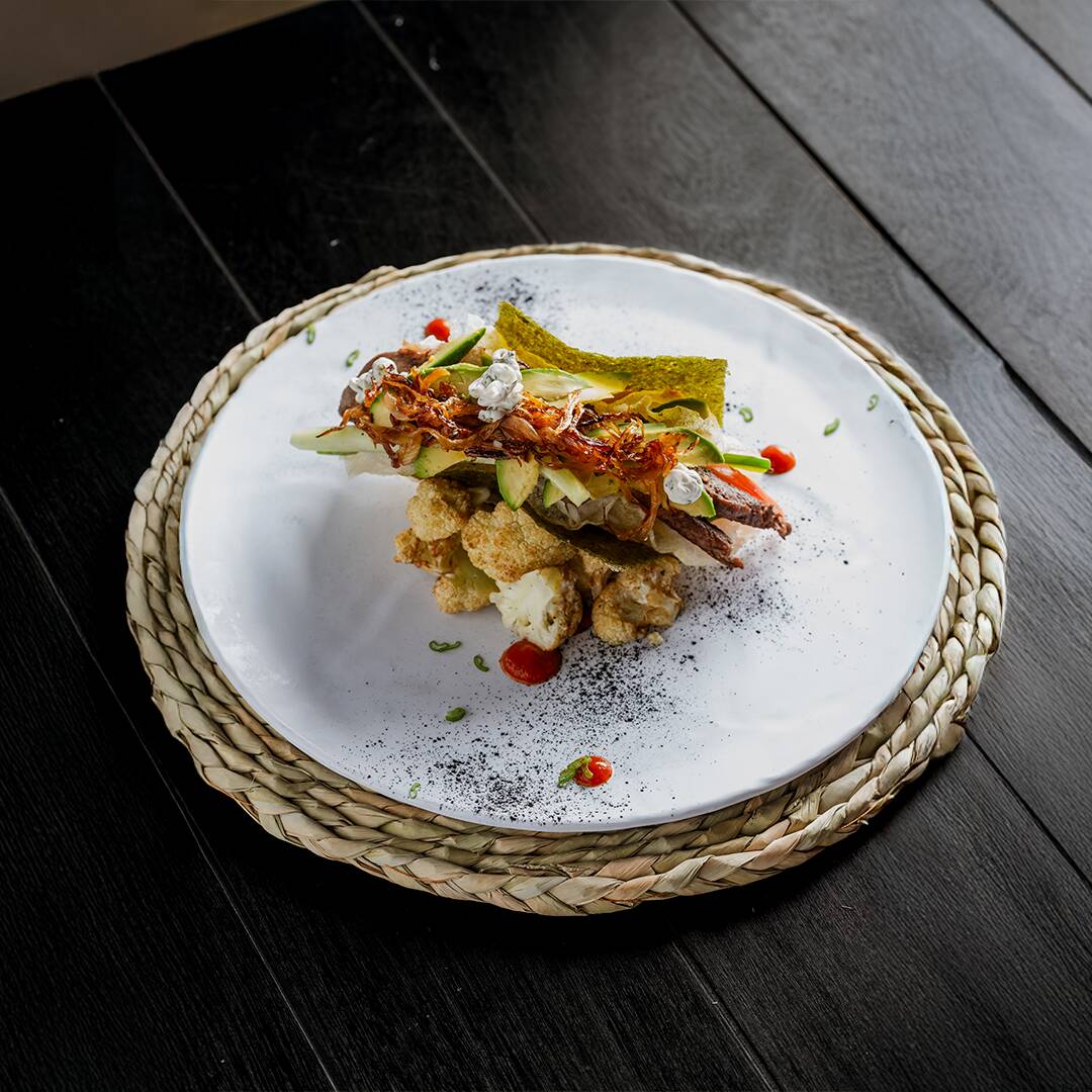 Rollo de arroz frito relleno de , cebolla caramelizada, cremoso de cilantro, morrón rojo y aguacate. Acompañado de coliflor rostizada, cremoso de sriracha y chiles chamuscados.