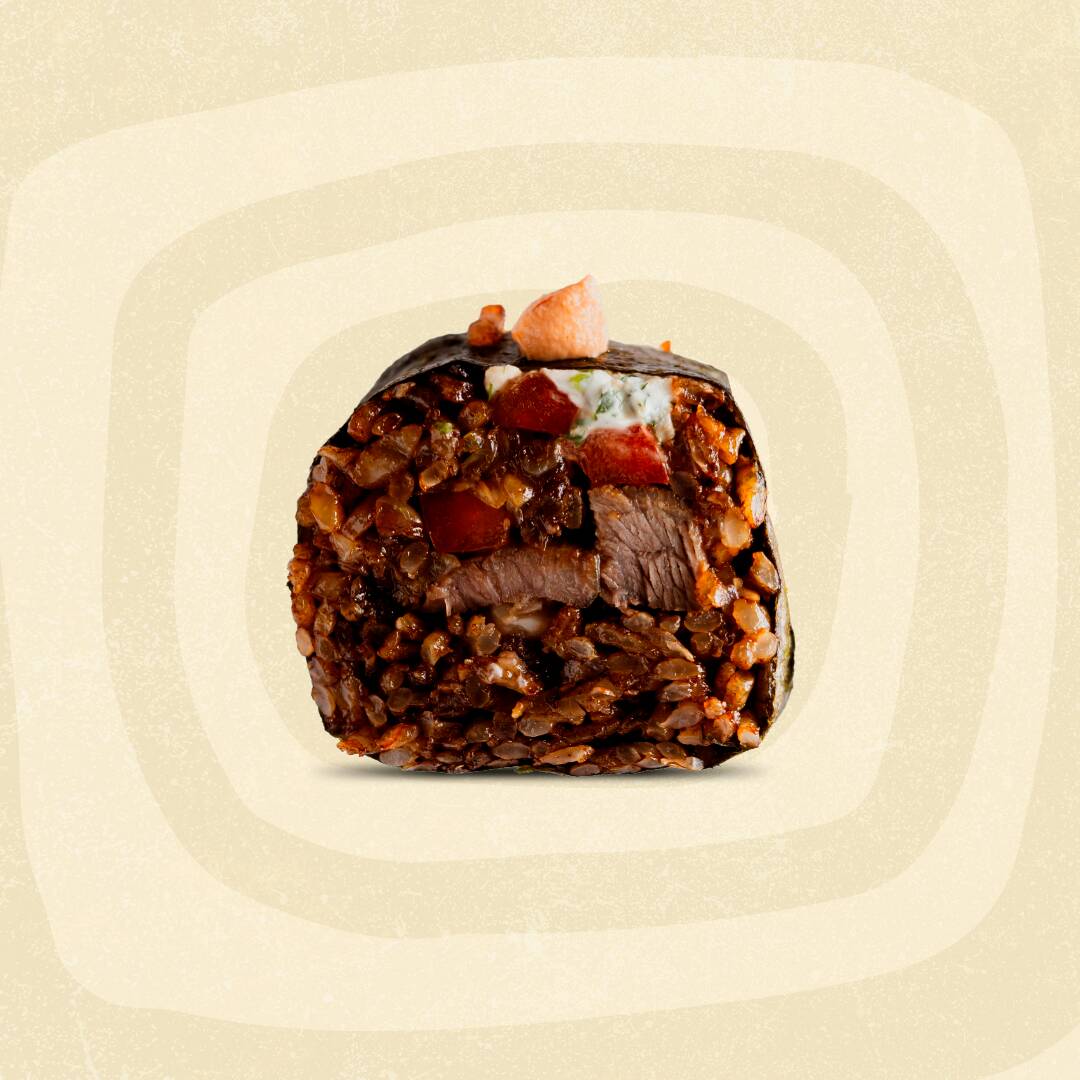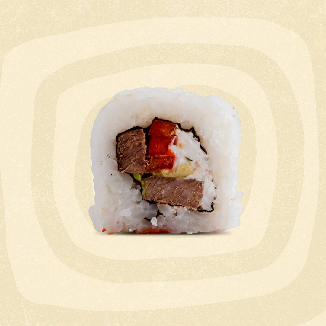Tortilla frita de arroz y nori, rellena de arroz gohan, picaña, cremoso de cebolla, morrón rojo y verde, cebollitas cambray y aguacate. Acompañado de salsa de sriracha de la casa y chiles chamuscados.