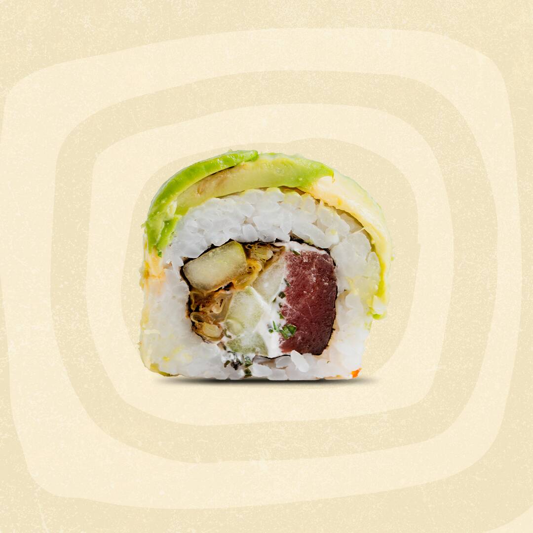 Cubierto de aguacate y sésamo blanco, relleno con nori, surimi, cebolla caramelizada, aguacate, pepino y cremoso de albahaca.