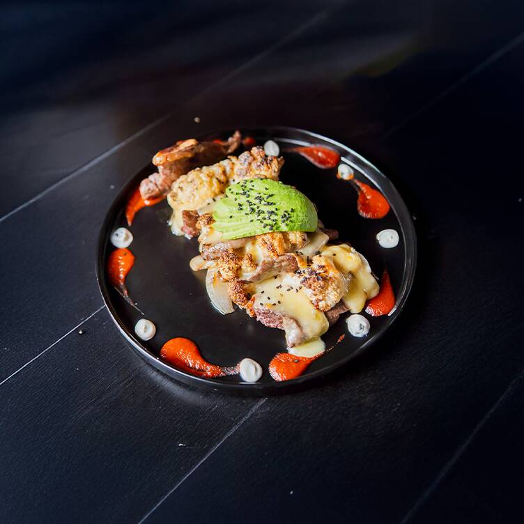 Picaña, cebolla caramelizada, queso manchego, empanizados, acompañados de nopalitos asados con cremoso de cebolla y cremoso de cilantro baby y chiles chamuscados.