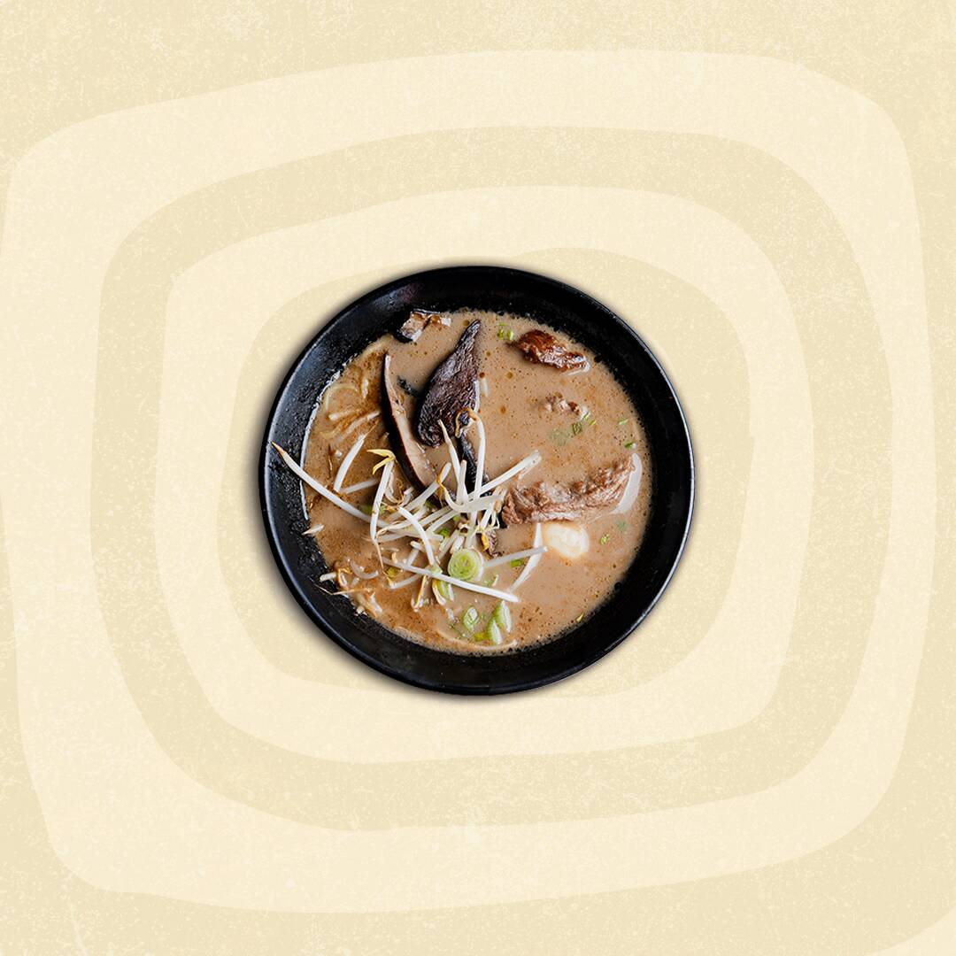 Delicioso ramen con carne ribeye, noodles, portobello, huevo curado y germen de soya.