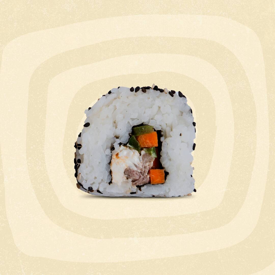 Cubierto de nori, con relleno de surimi tempura, cremoso de sésamo, portobello y pepino.