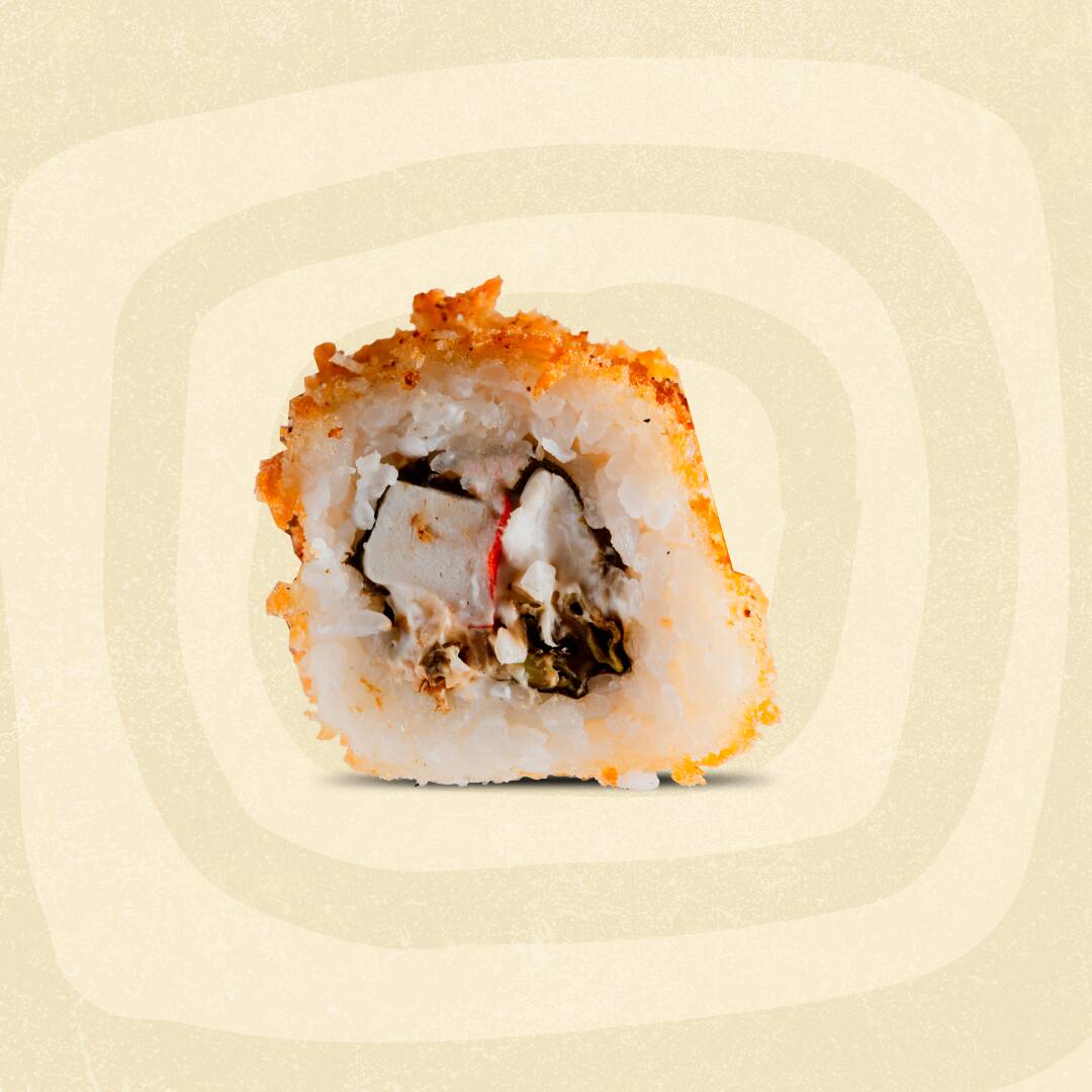 Empanizado, con relleno de nori, surimi, ejotes a la soja, cremoso de cebolla, cebolla caramelizada.