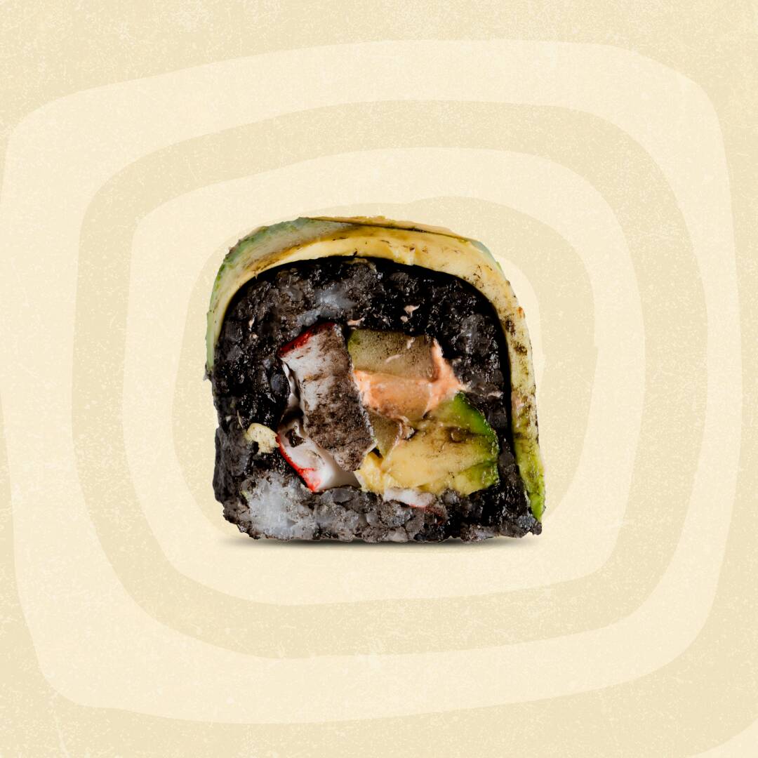 Cubierto de aguacate y sésamo blanco, relleno de arroz negro, nori, surimi, aguacate, pepino y cremoso de sriracha.