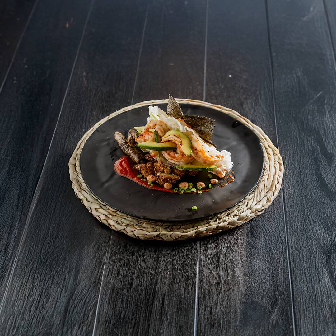 Tortilla frita de arroz y nori, rellena de arroz gohan, camarones, cremoso de sriracha, pepino, apio y aguacate. Acompañado de salsa sriracha de la casa y chiles chamuscados.