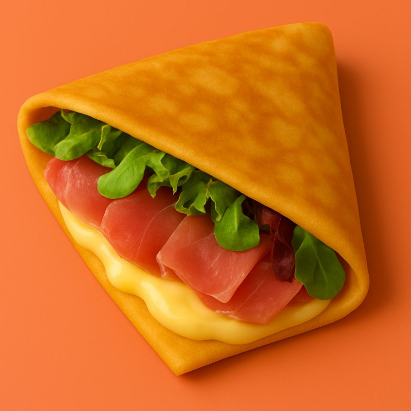 Crepa dorada con queso manchego fundido, jamón serrano y ensalada primavera. Fresca, ligera y deliciosa.