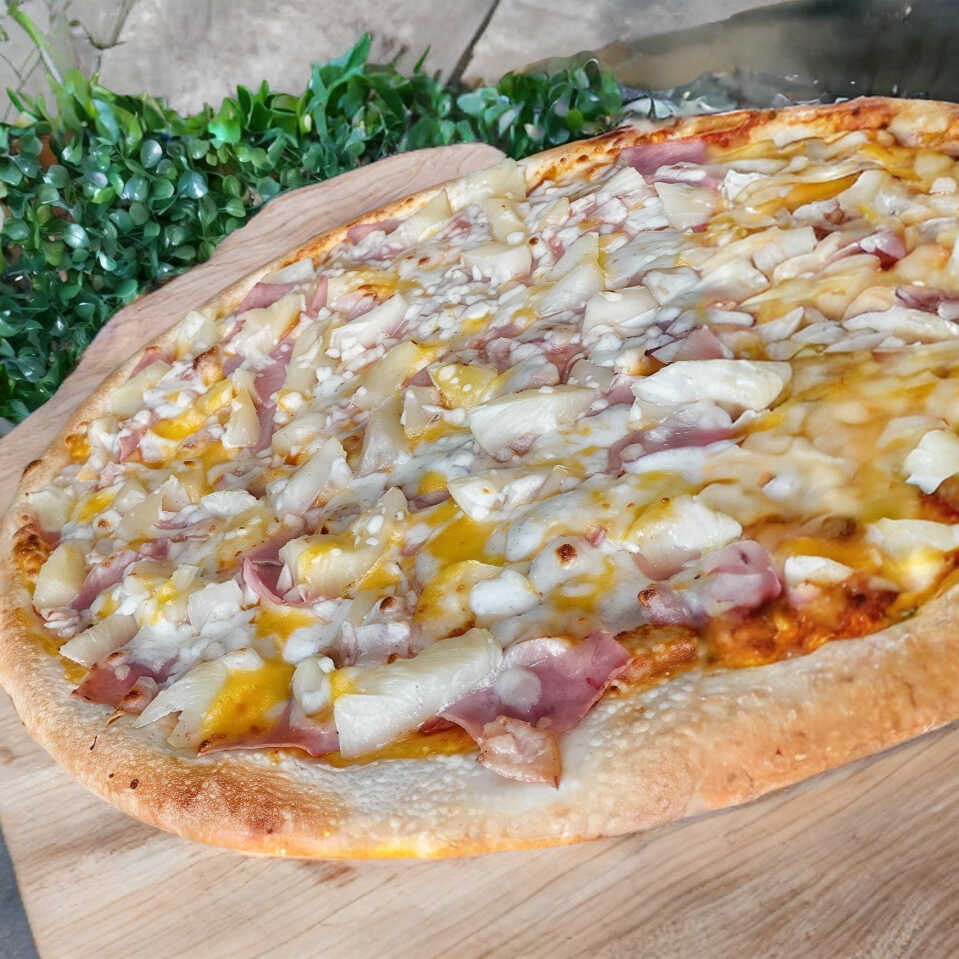 Pizza combinada, mitad peperoni y mitad hawaiana, incluye chimichurri