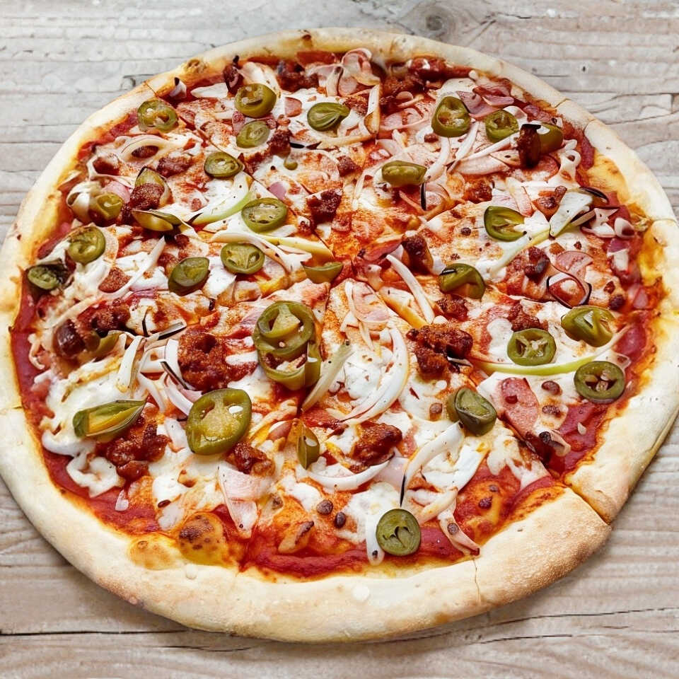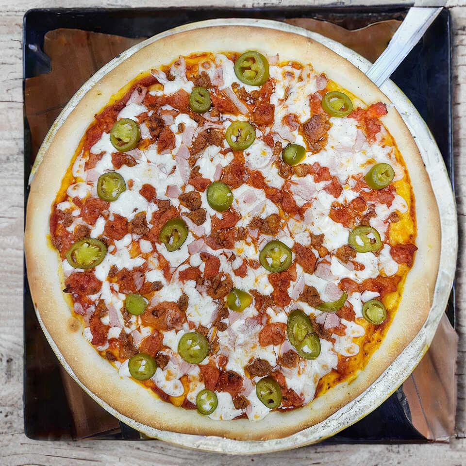 Mozzarella, chorizo, tocino, pastor y jalapeño