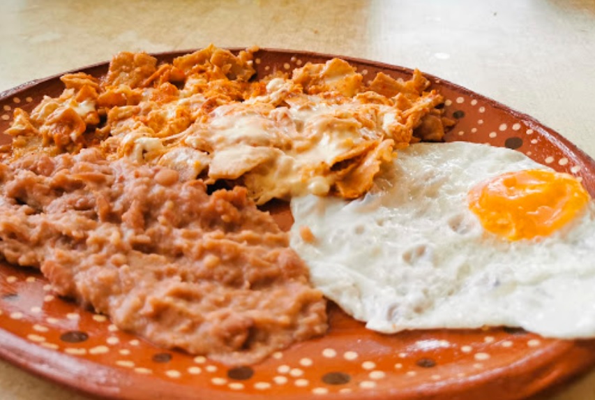 Ricos chilaquiles con salsa roja, acompañados con frijoles, pollo, queso y huevo estrellado o revuelto.