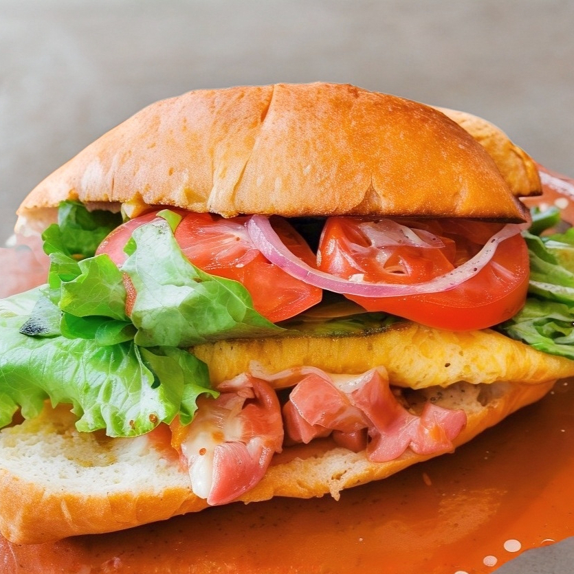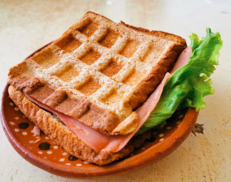 Sandwich de jamón, queso amarillo y queso blanco, aguacate, jitomate, lechuga y cebolla.