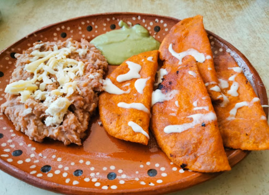 Orden de enchiladas potosinas rojas, acompañadas de frijoles, queso, crema y guacamole.