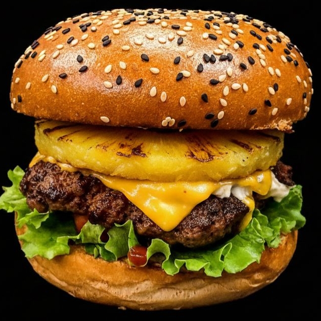 Carne de res 160gr, tocino, queso crema, piña, habanero, queso amarillo, lechuga, jitomate, cebolla