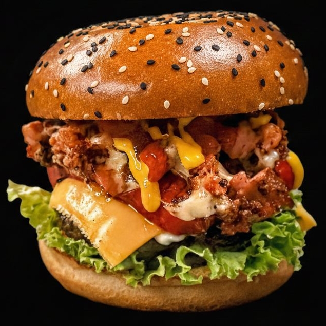 Carne de res 160gr, tocino, queso crema, queso blanco, queso amarillo, lechuga, jitomate, cebolla