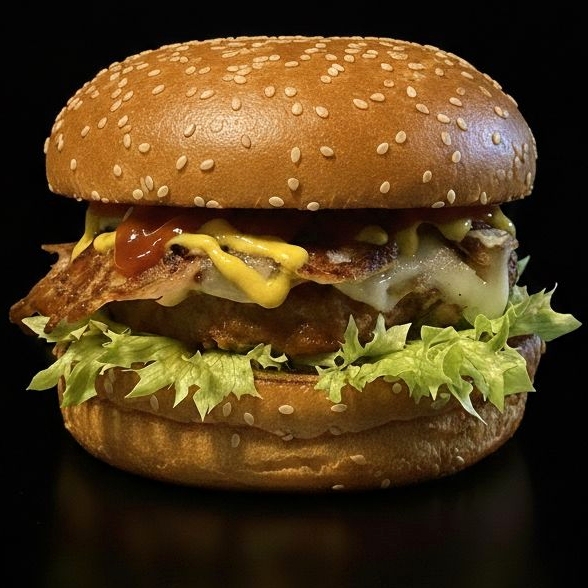 Hamburguesa de pollo, costra de queso blanco encima queso crema cubierta de queso amarillo con lechuga, jitomate, cebolla, y aderezos TODAS LAS HAMBURGUESAS INCLUYEN PAPAS