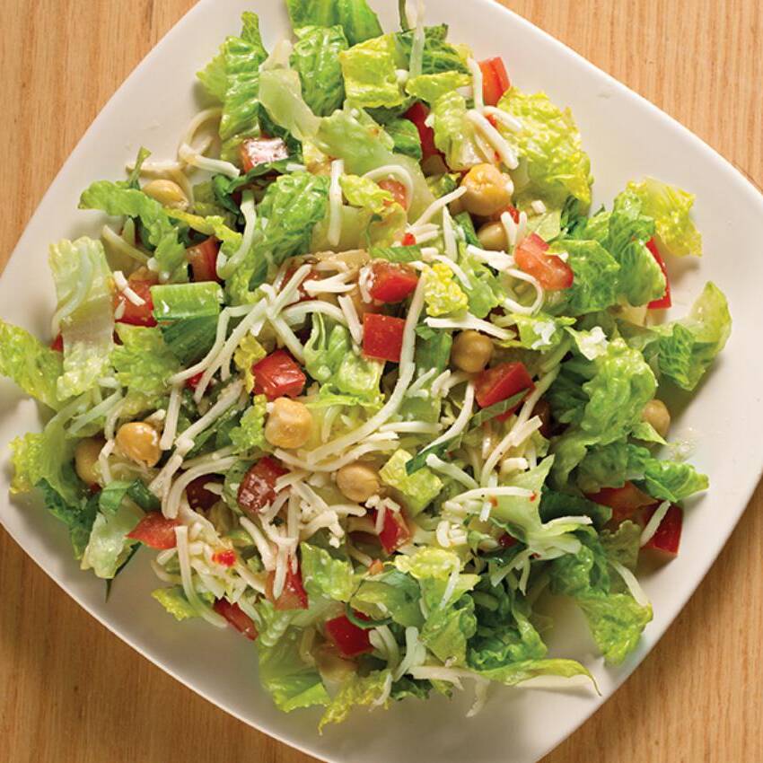 Fresca ensalada de lechuga, arúgula, manzana, trozos de nuez, fresa, queso feta y aderezo ranch.