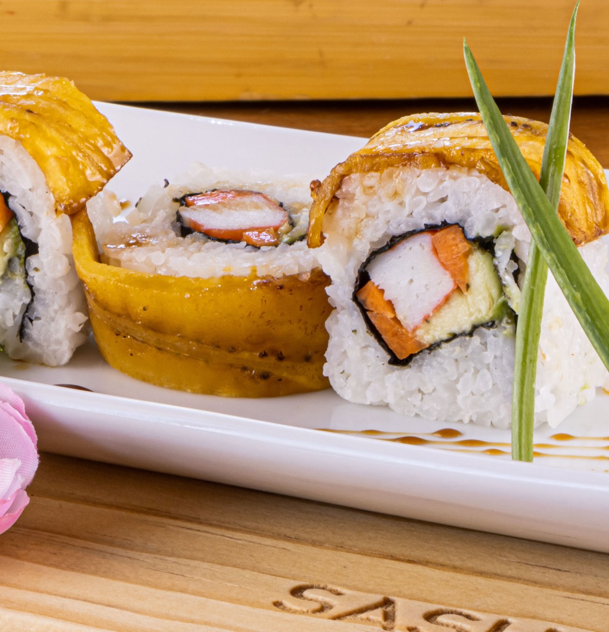 Surimi, aguacate, zanahoria, queso crema y plátano frito por fuera.