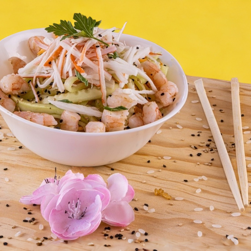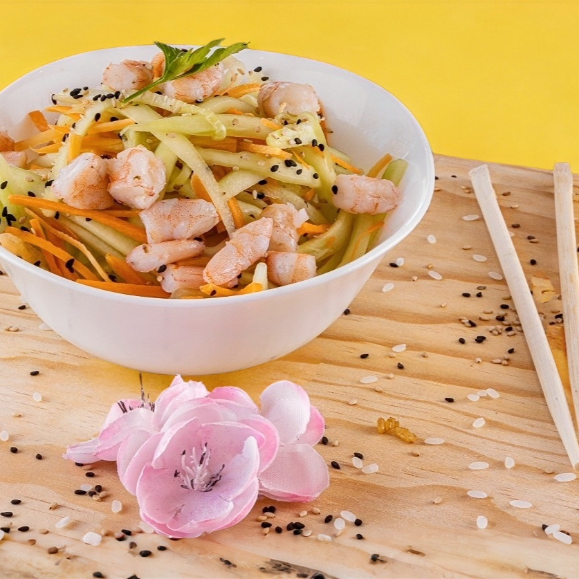 Juliana de pepino, zanahoria, surimi, camarón, furikake y vinagreta de ajonjolí.