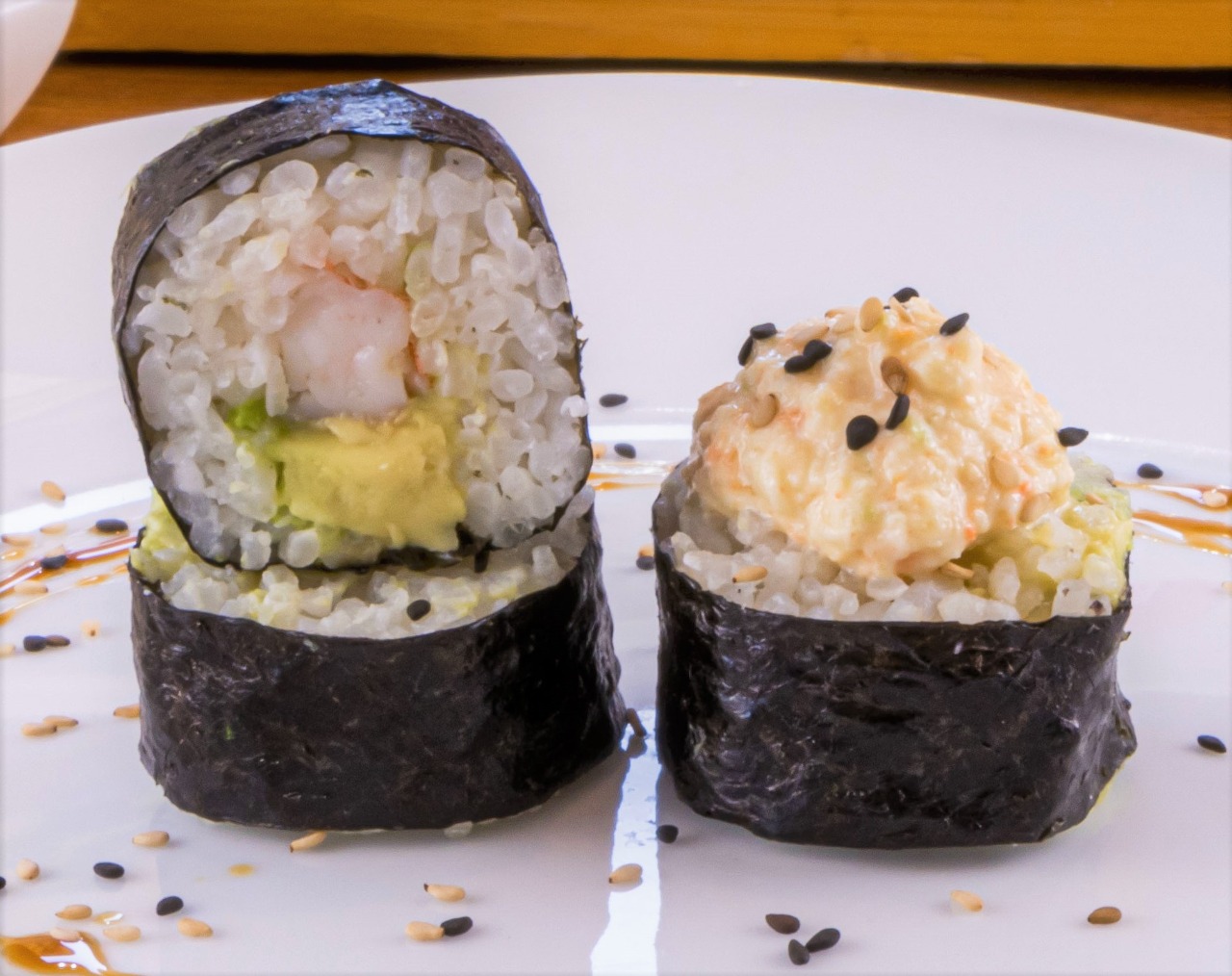 Tampico, aguacate, alga nori por fuera, más tampico, ajonjolí y salsa de anguila.