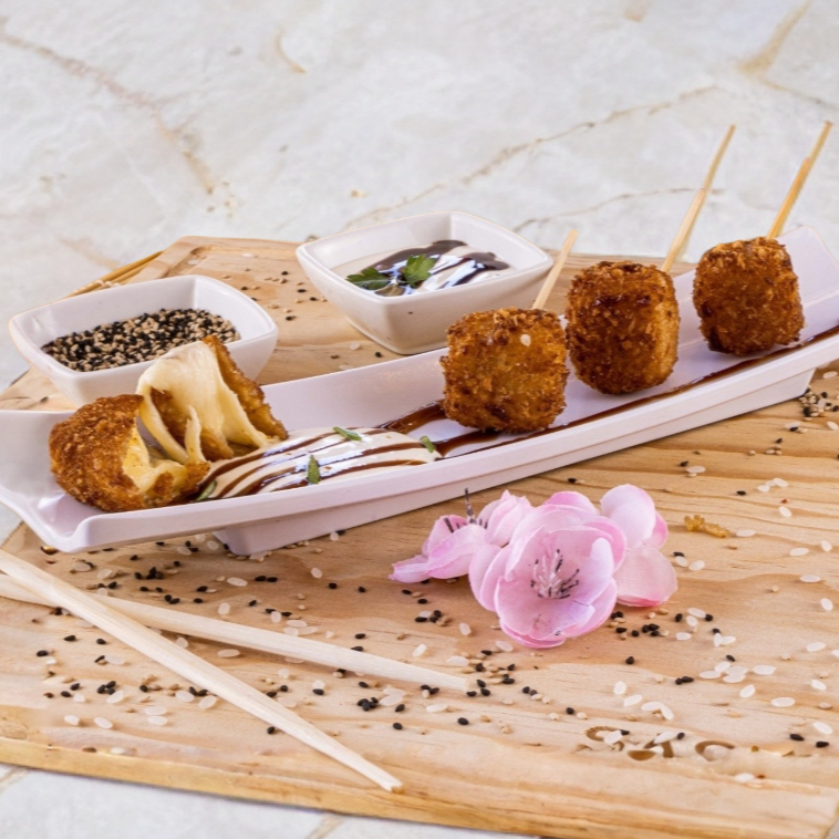 Makis california, kani, tataki, gyosas, 8 brochetas de queso y arroz.