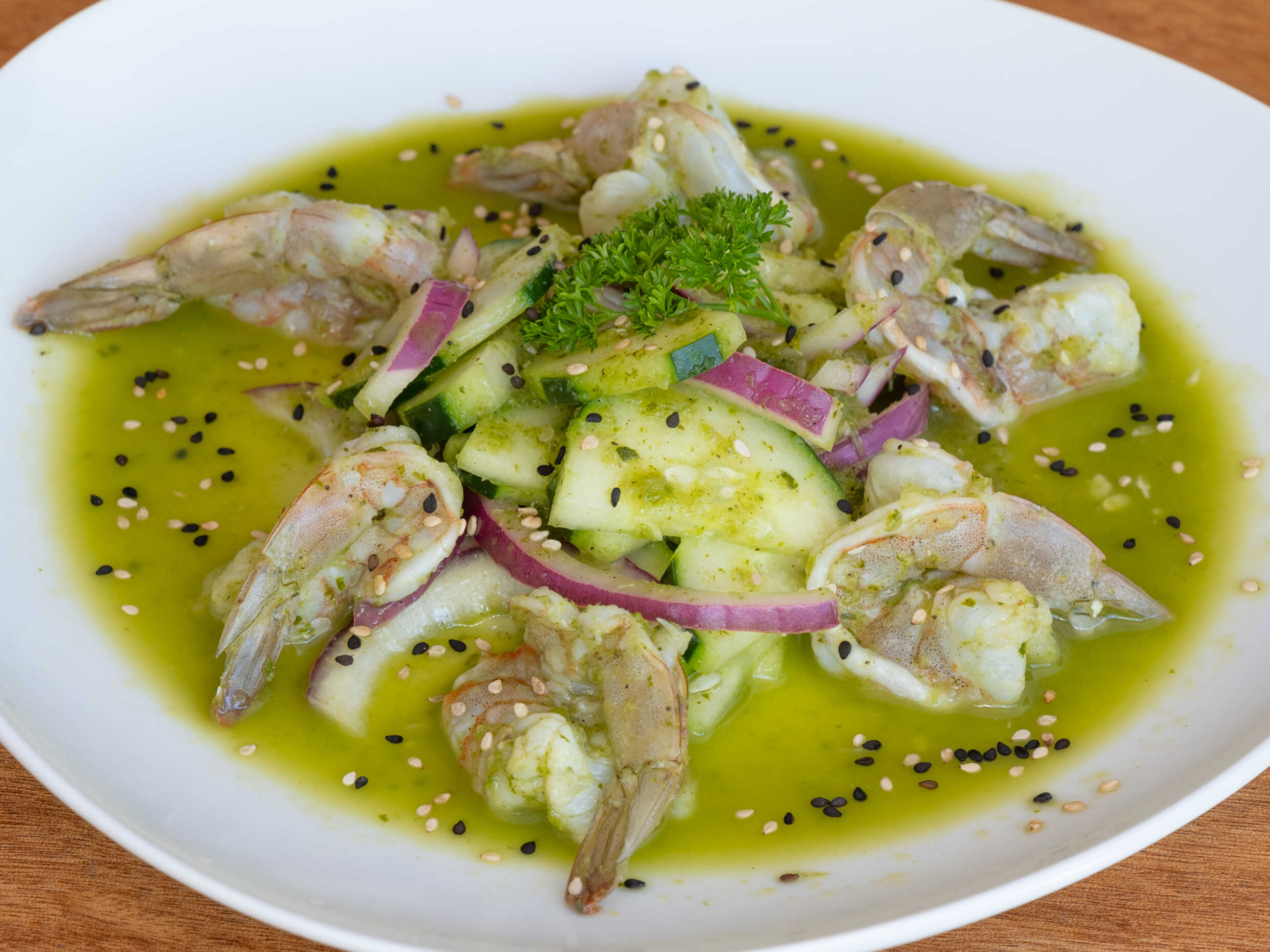 6 pz. Camarones en aguachile verde con esencia de ajonjolí, acompañado de tostadas wonton.