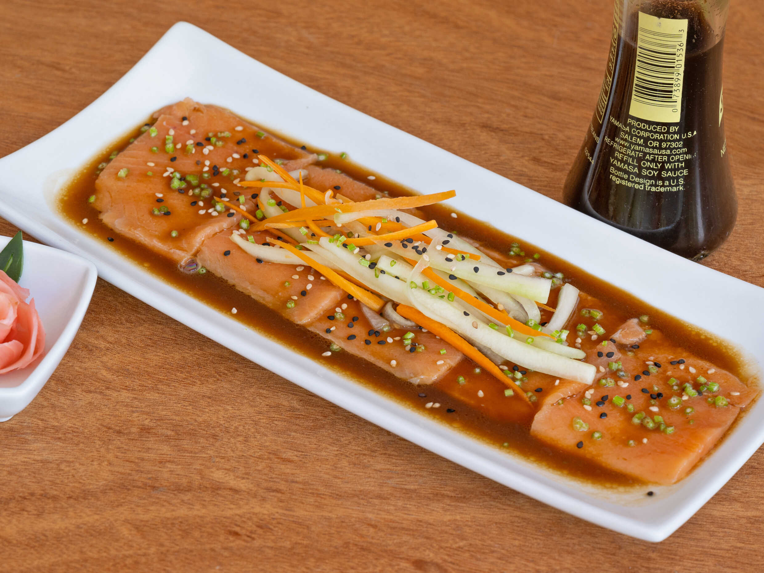 Láminas de salmón fresco en vinagreta de la casa, cebollín, ajonjolí, acompañado de tostadas wonton.