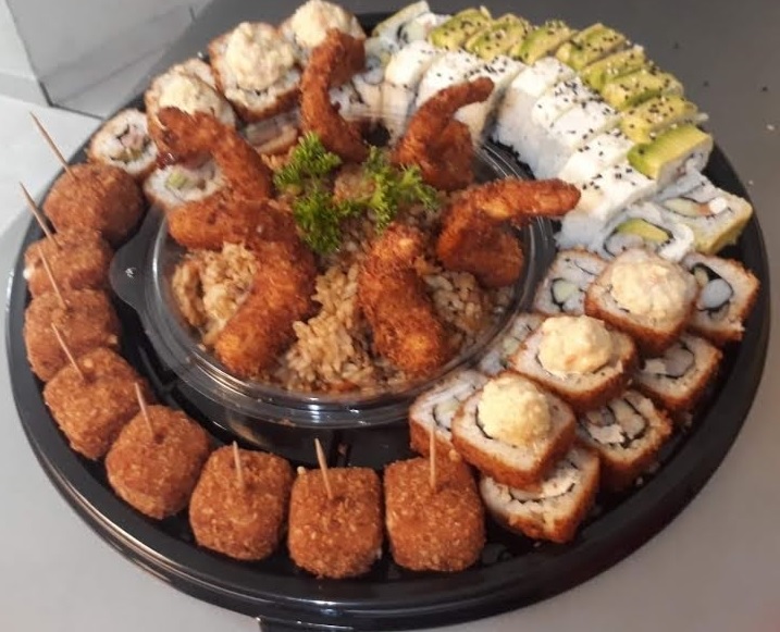 Makis california, kani, tataki, shi ho y 8 brochetas de queso.