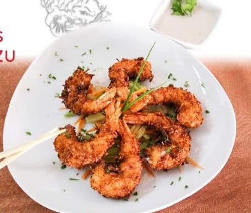 6 pz. Camarones empanizados al coco, acompañados de salsa de coco.