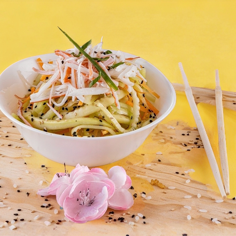 Juliana de pepino, zanahoria, surimi, furikake y vinagreta de ajonjolí.