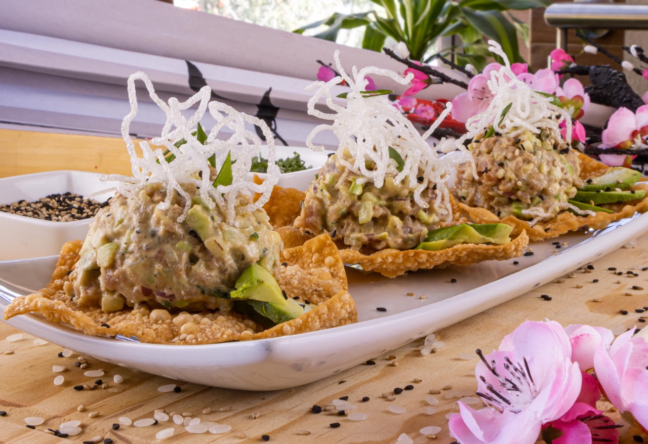Ceviche de atún marinado en limón acompañado de pepino, aguacate, cebolla morada y tostadas wonton.