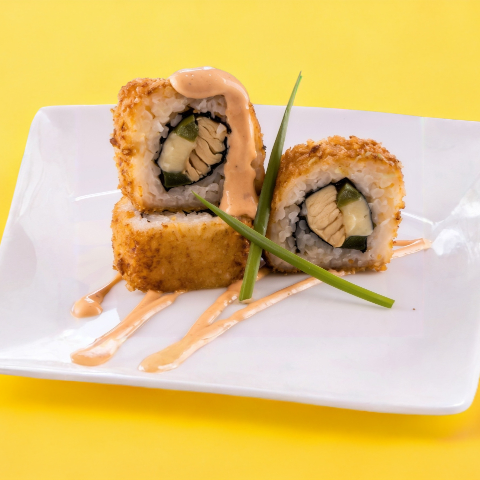 Camarón, aguacate, queso crema, aderezo de chipotle y empanizado.