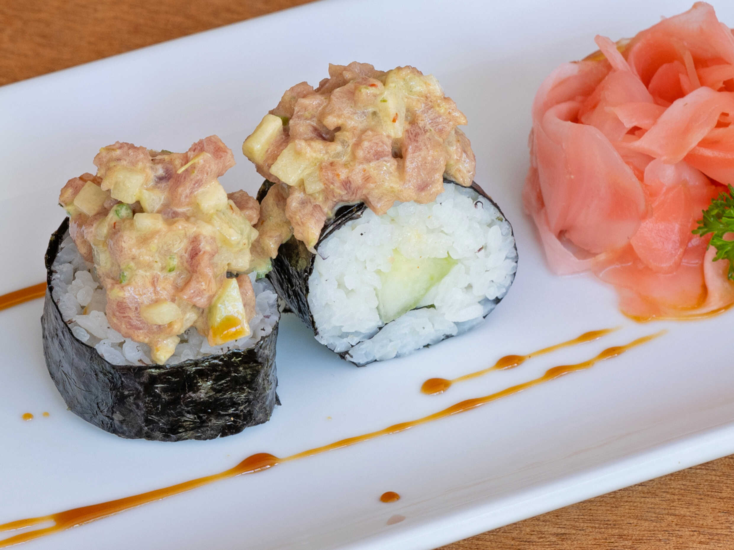 Atún fresco con aderezo spicy, pepino, cebollín y alga por fuera.