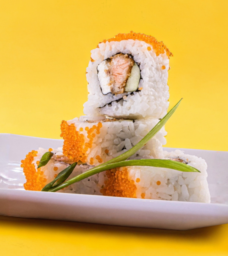 Anguila, zanahoria, pepino, queso crema, aguacate por fuera, tampico, cebollín y aguacate.