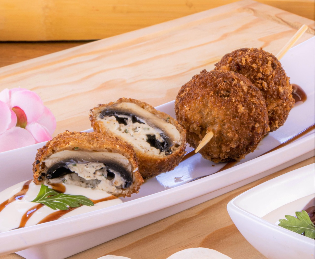 3 pz. Brochetas de champiñón rellenos de queso crema y empanizadas.